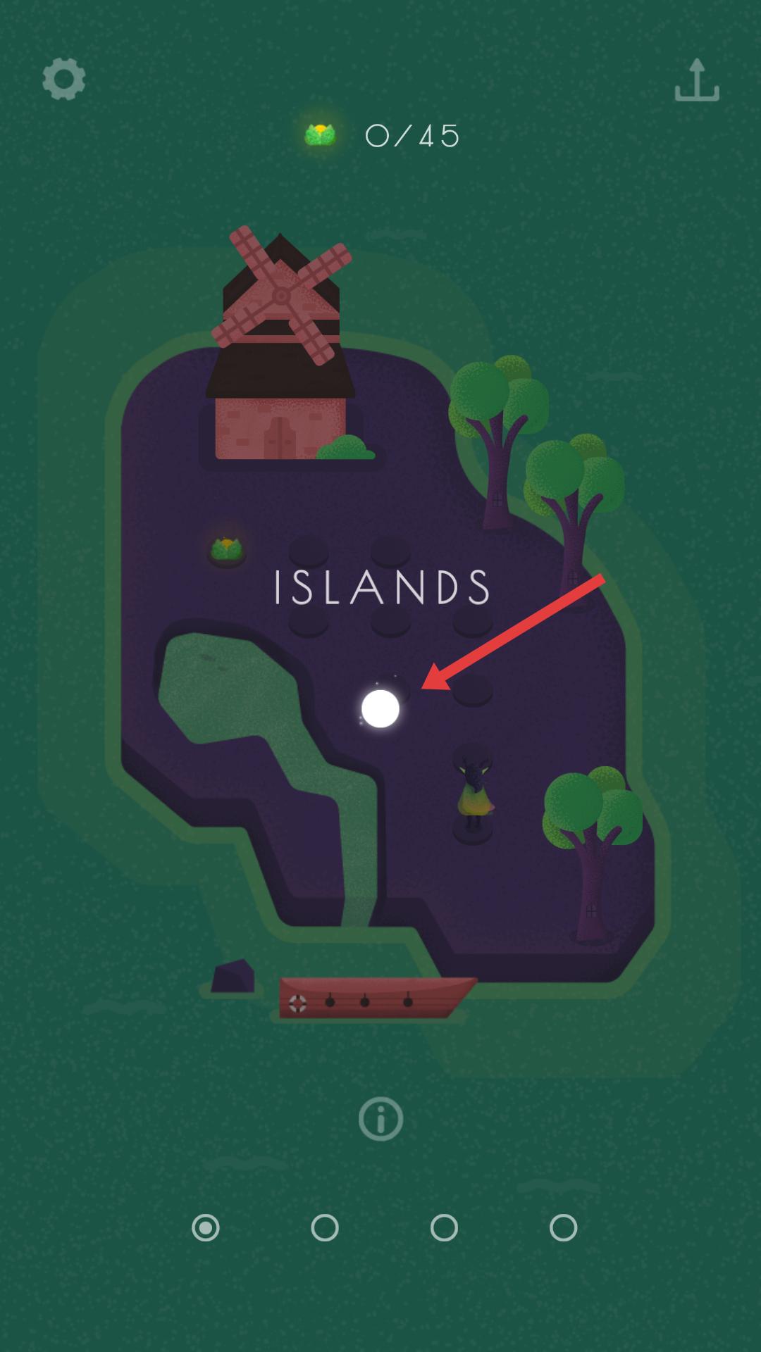1、游戲初始界面有白色圓點和點擊開始提示,點擊白色圓點可啟動游戲,進入島嶼場景開始冒險。