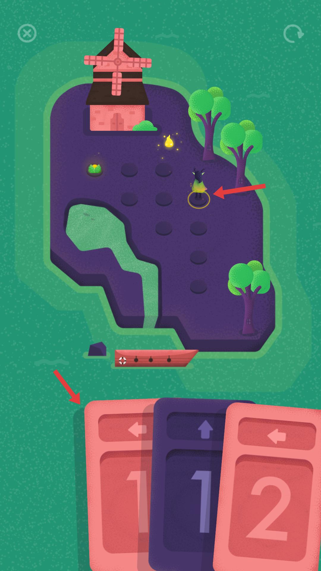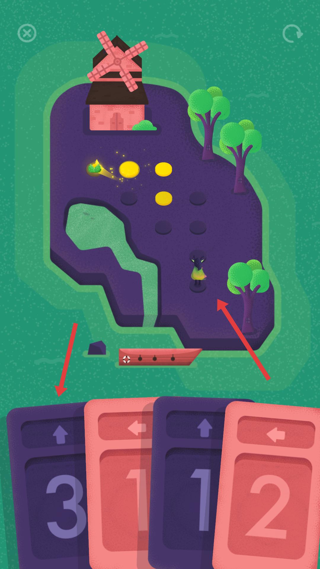 3、在島嶼場景中,利用下方帶方向和數字的卡片,選擇合適卡片操控角色移動,收集硬幣,同時注意場景中的角色和物品。