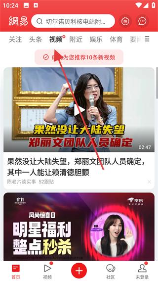 1、進入網易新聞app視頻頁面,瀏覽推薦的視頻內容,如鄭麗文團隊人員確定等視頻,了解熱點資訊的視頻報道。