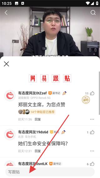 3、點擊寫跟貼進入跟貼頁面,查看其他用戶的跟貼內容,如為鄭麗文主席點贊等,參與視頻的評論互動。