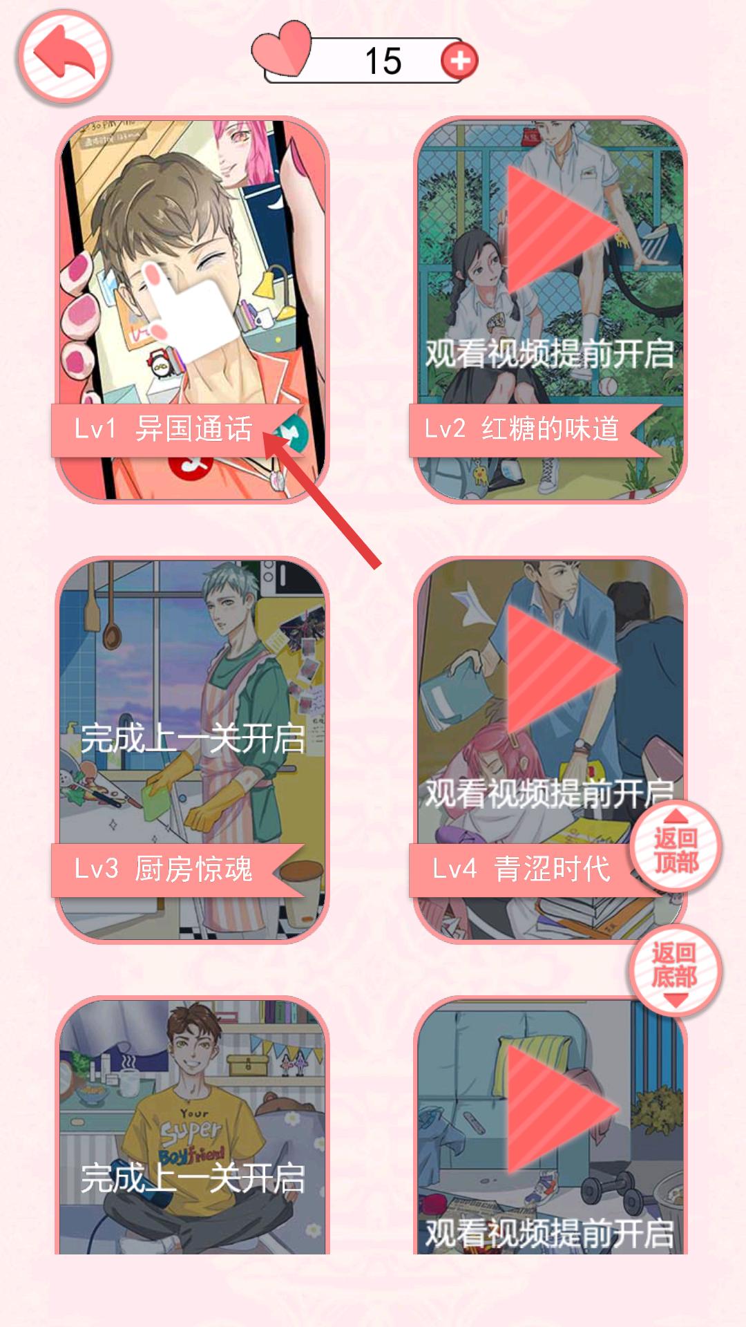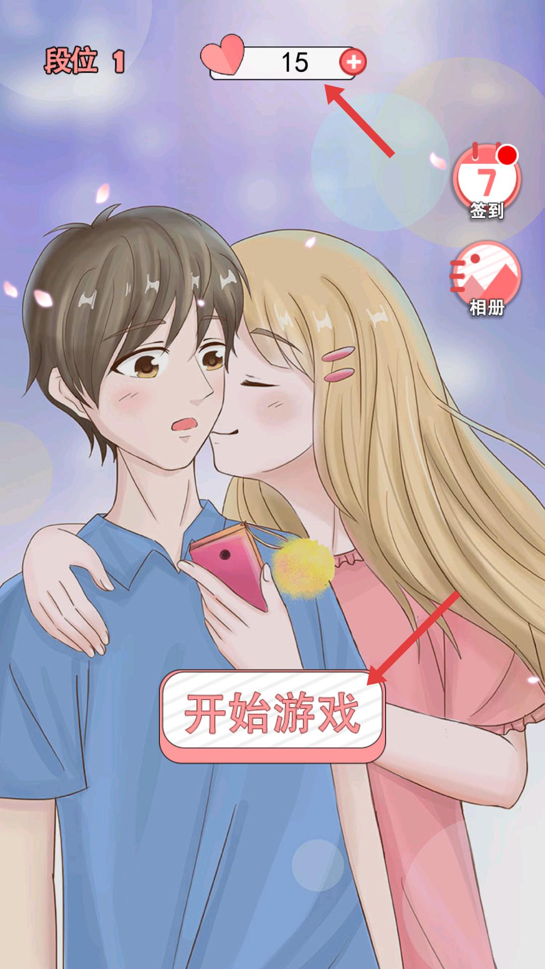 1、游戲主界面,點擊開始游戲按鈕,進入關卡選擇界面,可看到不同關卡,準備開啟戀愛主題的游戲挑戰,積累愛心等資源。