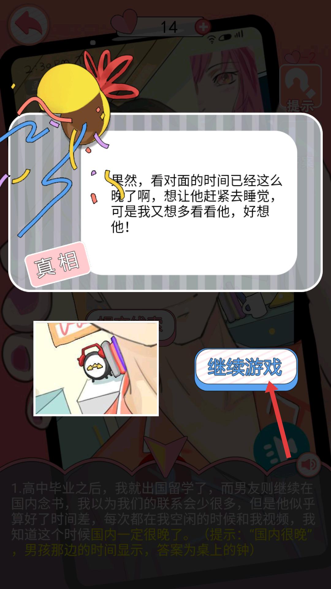 4、提交線索正確后,會出現真相彈窗,了解劇情內容后,點擊繼續游戲,可進入下一部分,繼續探索戀愛劇情。