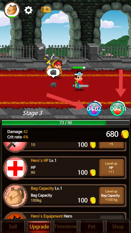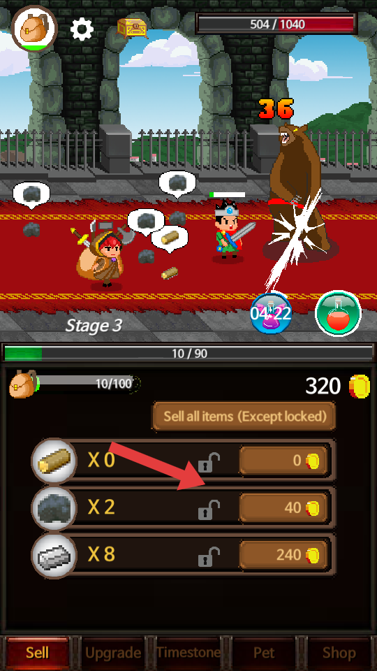 1、戰斗后進入物品界面,找到箭頭指向的物品欄,點擊對應物品右側按鈕,可售賣物品獲取金幣,用于強化角色。