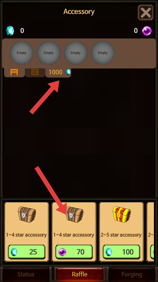 2、進入Accessory界面,積累足夠道具后,按箭頭提示選擇寶箱,消耗對應資源開啟,獲取飾品提升戰力。