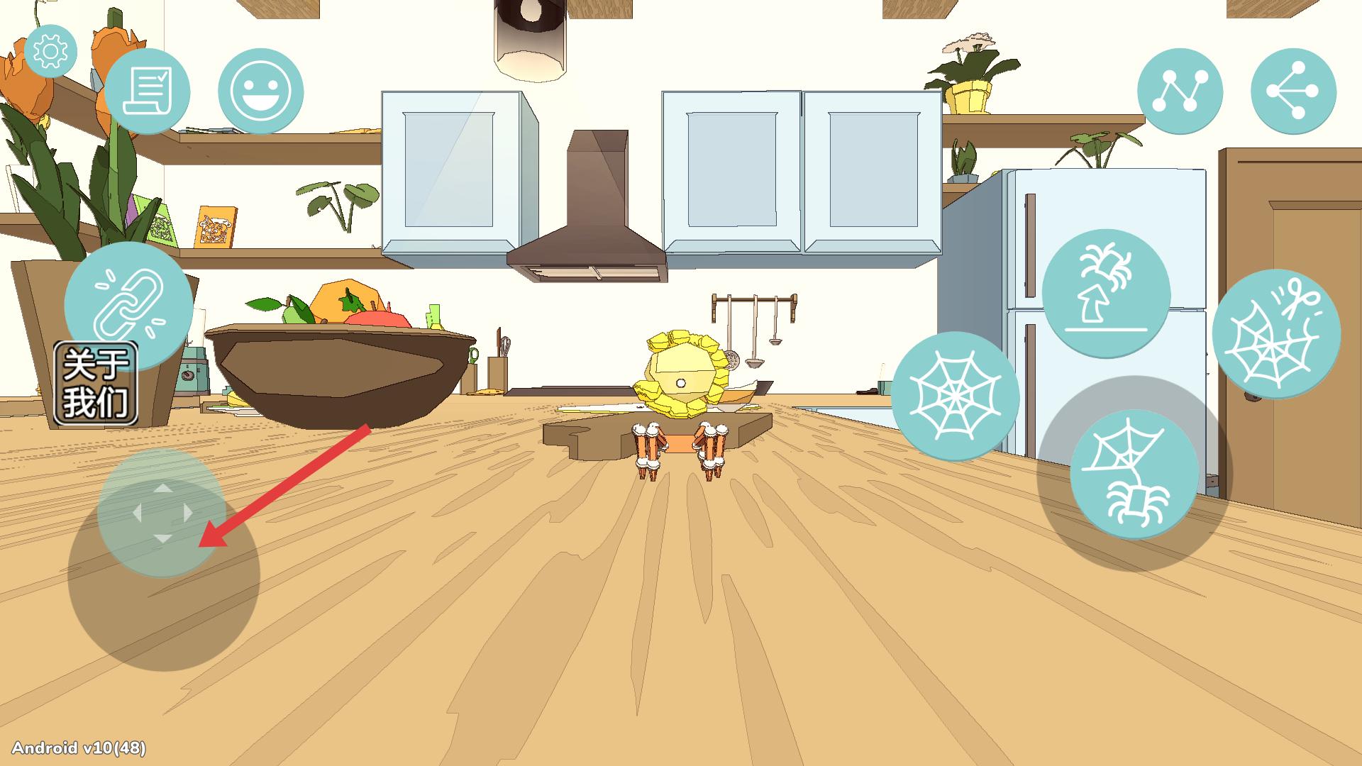 2、在廚房場景里,通過左側虛擬搖桿操控蜘蛛移動,探索周圍環境,尋找可互動的物品,為后續操作做準備。