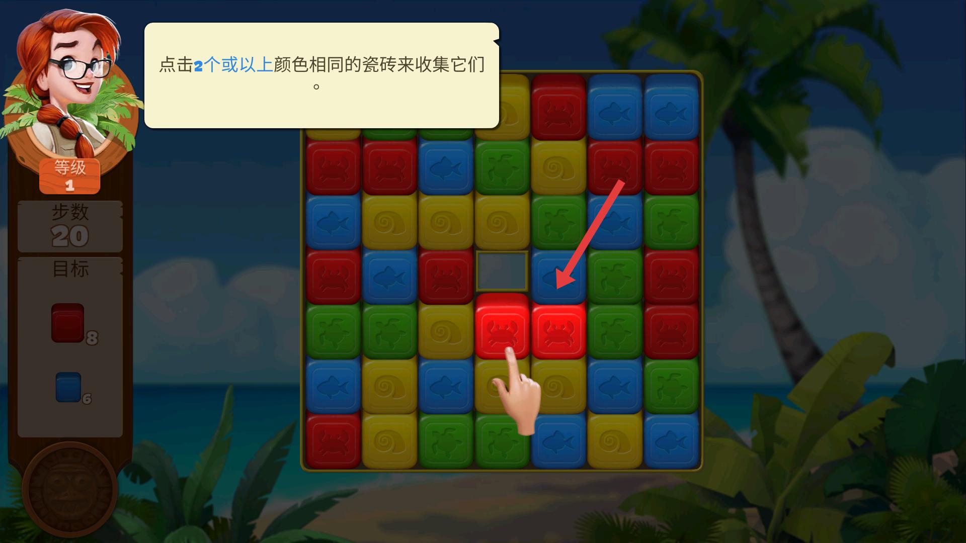 2、進入游戲后,按照提示點擊2個或以上顏色相同的瓷磚,收集它們,完成關卡目標,推進游戲進度。