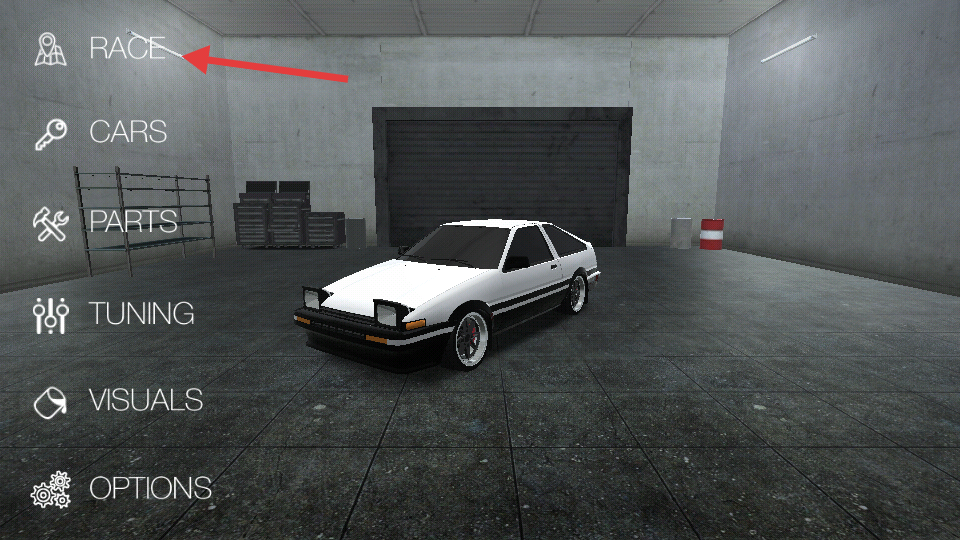1、進入漂移獵手游戲,點擊RACE選項進入賽車模式,此時可看到車庫里的車輛,為接下來的賽道競速做好準備。