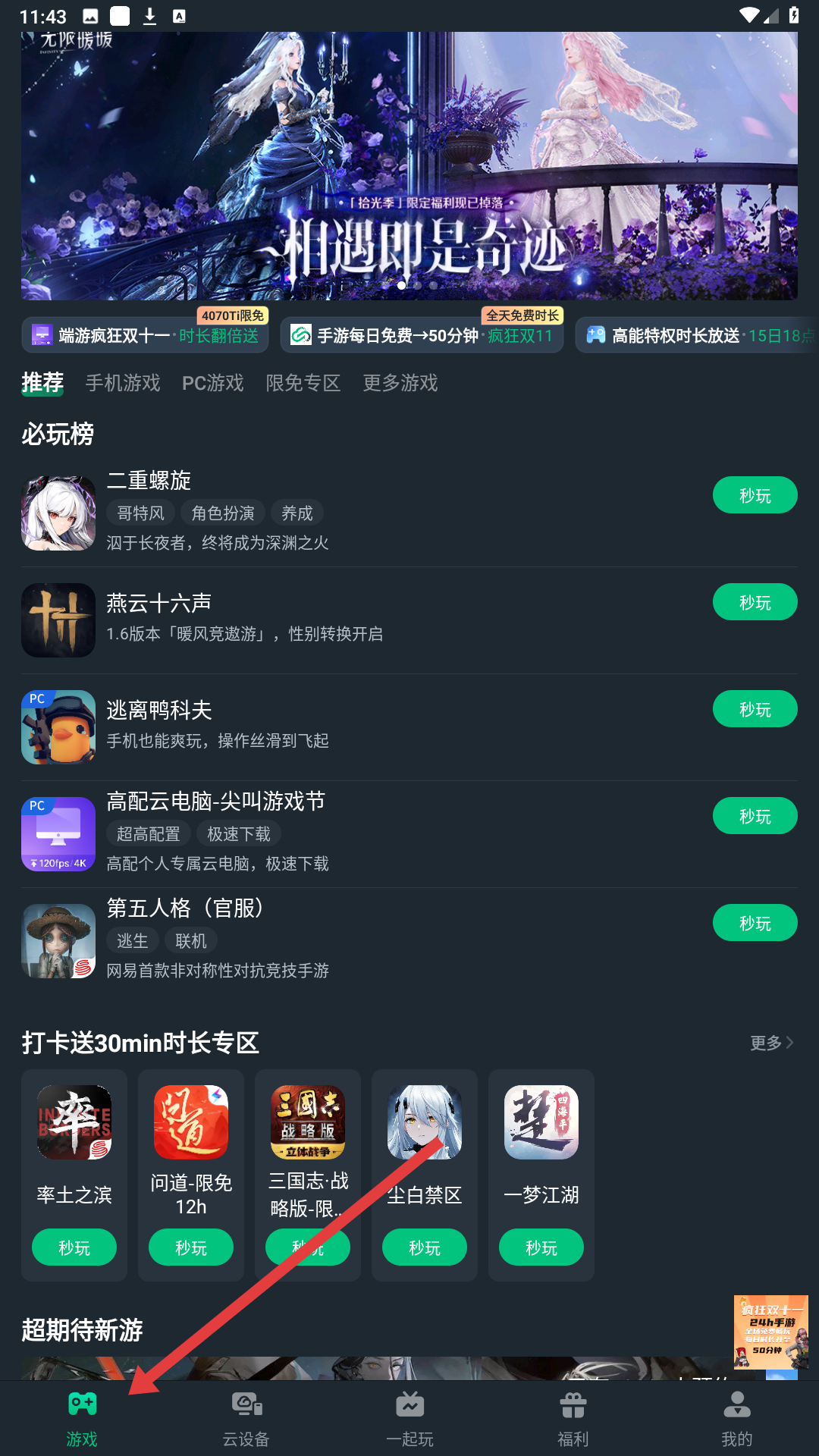 1、打開云游戲平臺,進入游戲頁面,可查看必玩榜、打卡送時長專區等游戲推薦,選擇感興趣的游戲點擊秒玩。