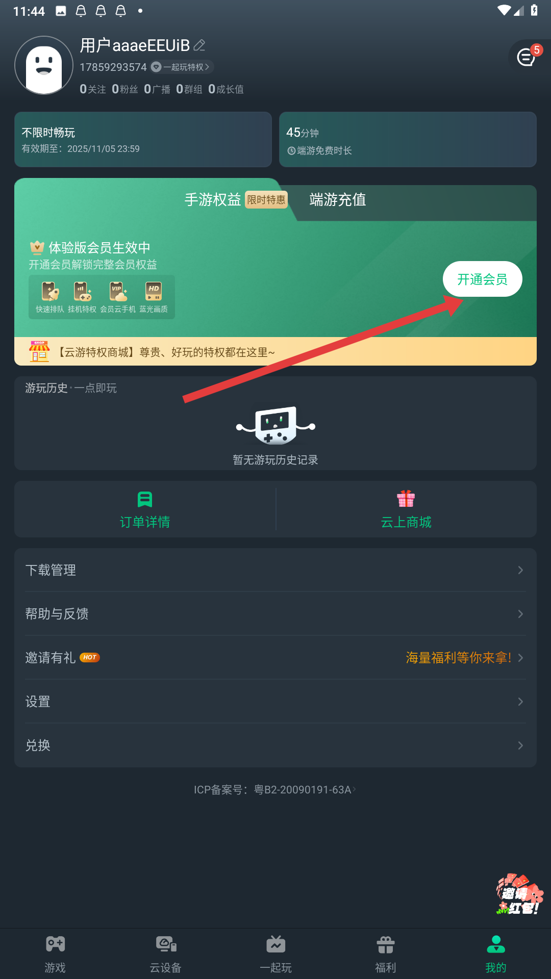 3、登錄后個人頁面可查看會員權益,點擊開通會員可解鎖完整會員權益,如快速排隊、掛機特權等。