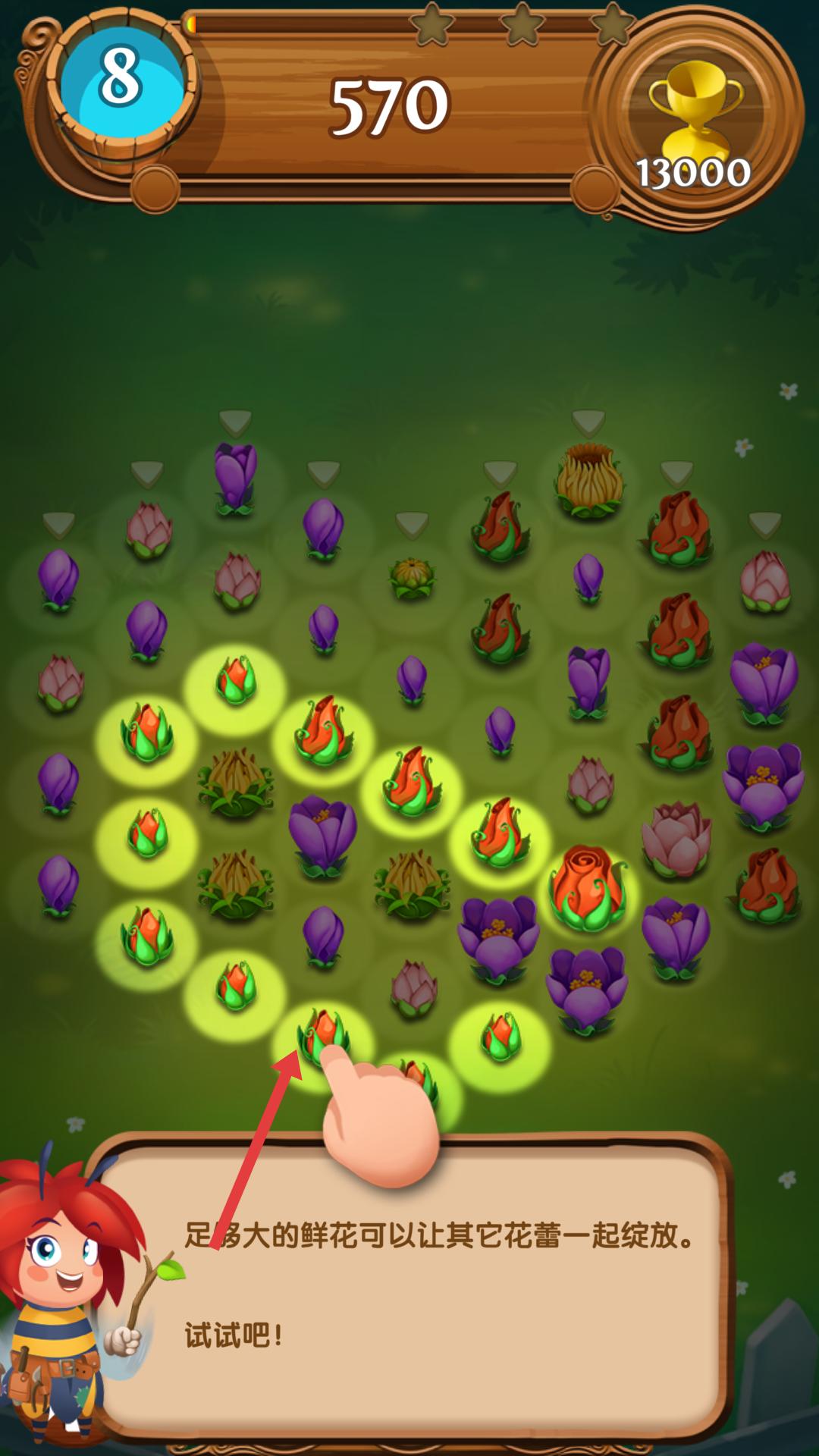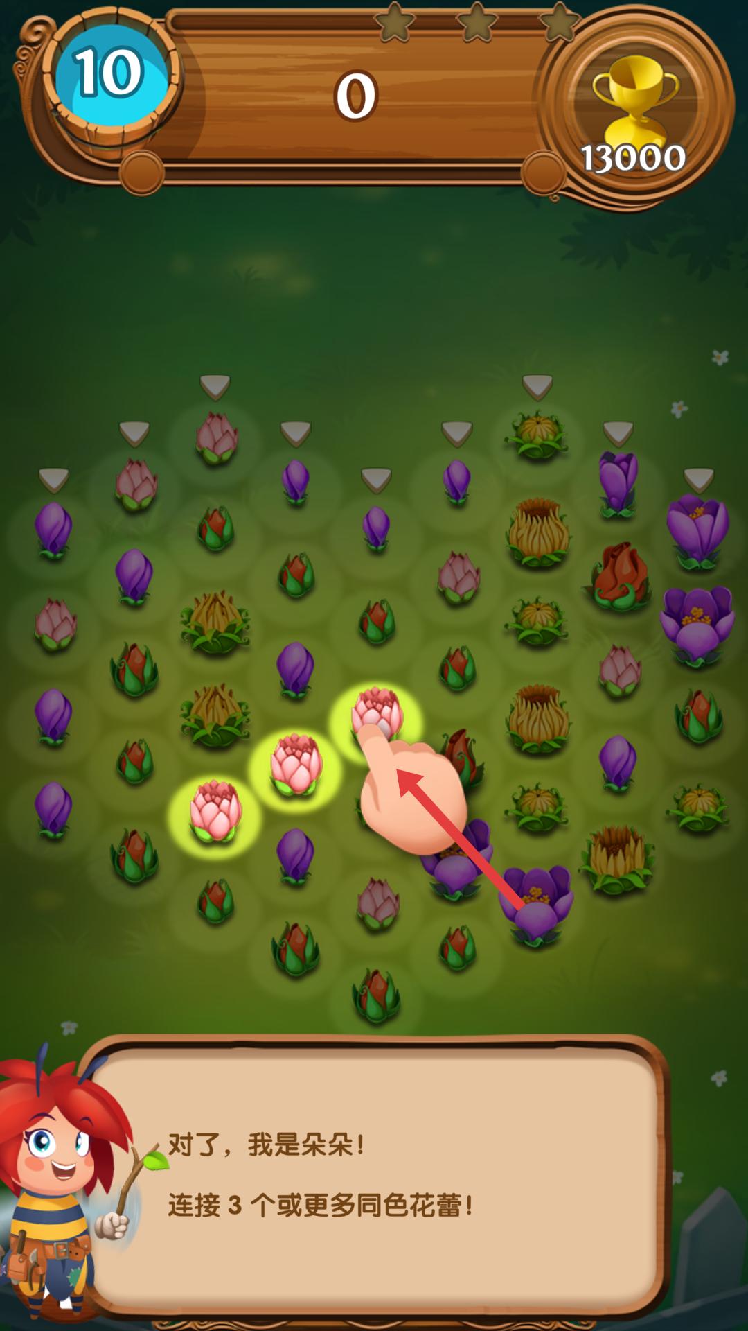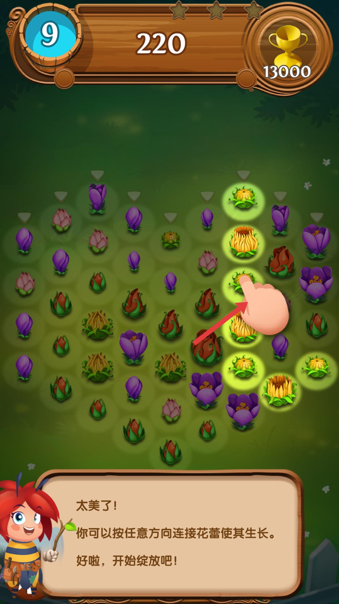 2、第一關里,按照提示,連接3個或更多同色花蕾,完成消除,獲取分數,推進關卡進程。