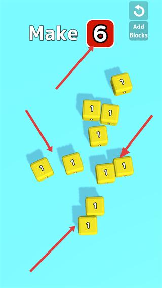 1、界面會顯示需要合成的目標數字,比如6,同時有多個標著1的黃顏色的方塊,需將這些方塊進行合成操作。