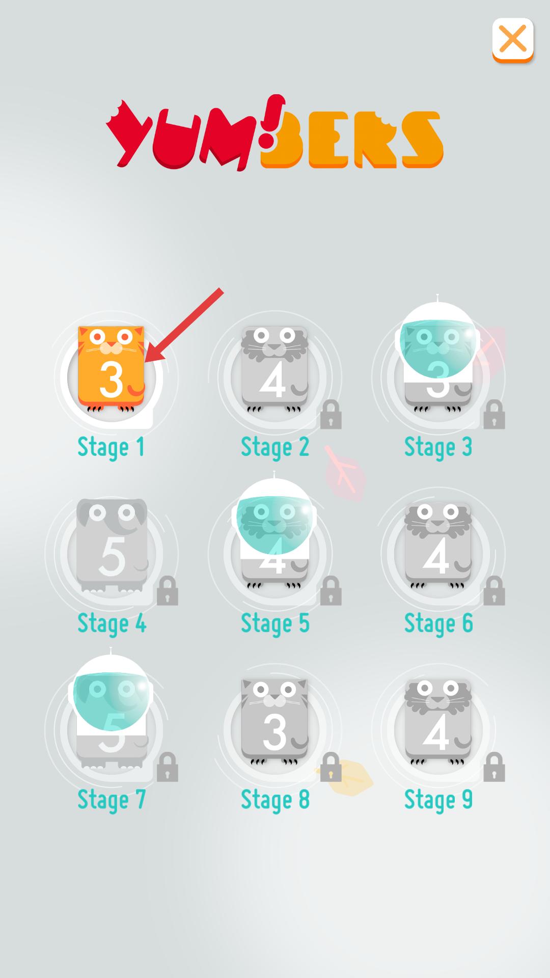2、進入關卡選擇界面,點擊箭頭所指,開始第一關,逐步熟悉游戲關卡的推進方式。