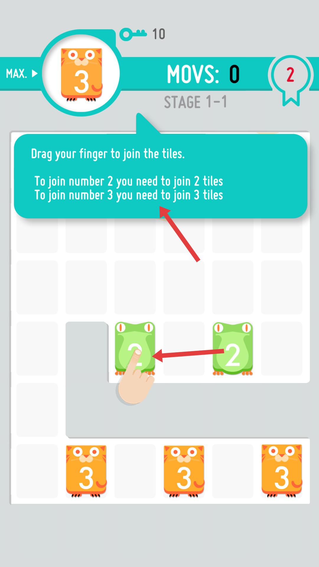 3、第一關里,按照提示,用手指拖動來連接方塊,連接數字2需要2個方塊,連接數字3需要3個方塊,以此完成操作。