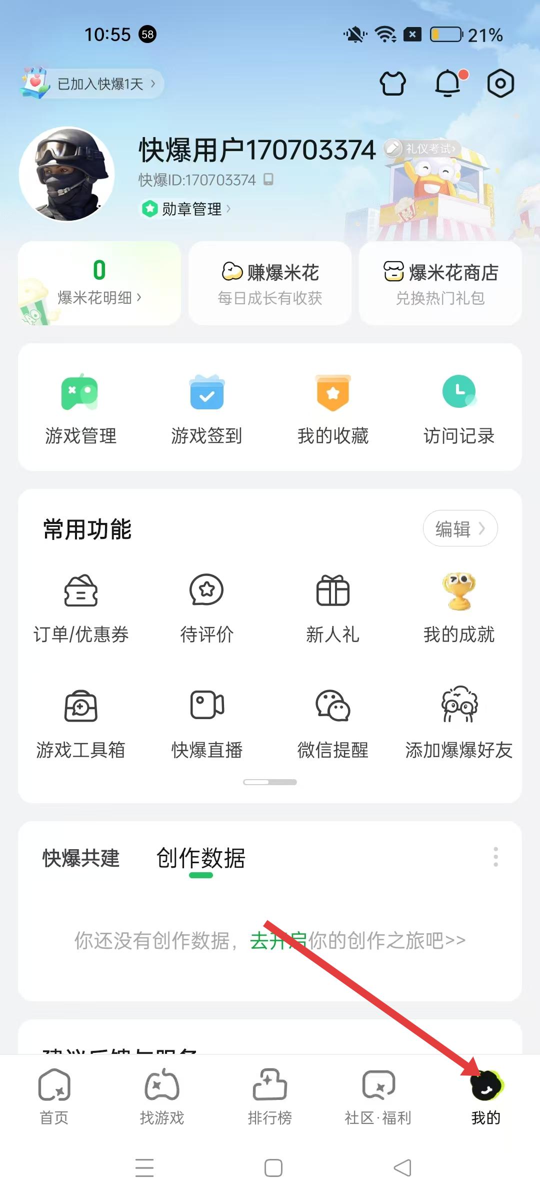 2、點擊底部我的標簽,進入個人頁面,可看到個人信息、爆米花明細等板塊,還有游戲管理、游戲簽到等功能選項,準備參與福利活動。