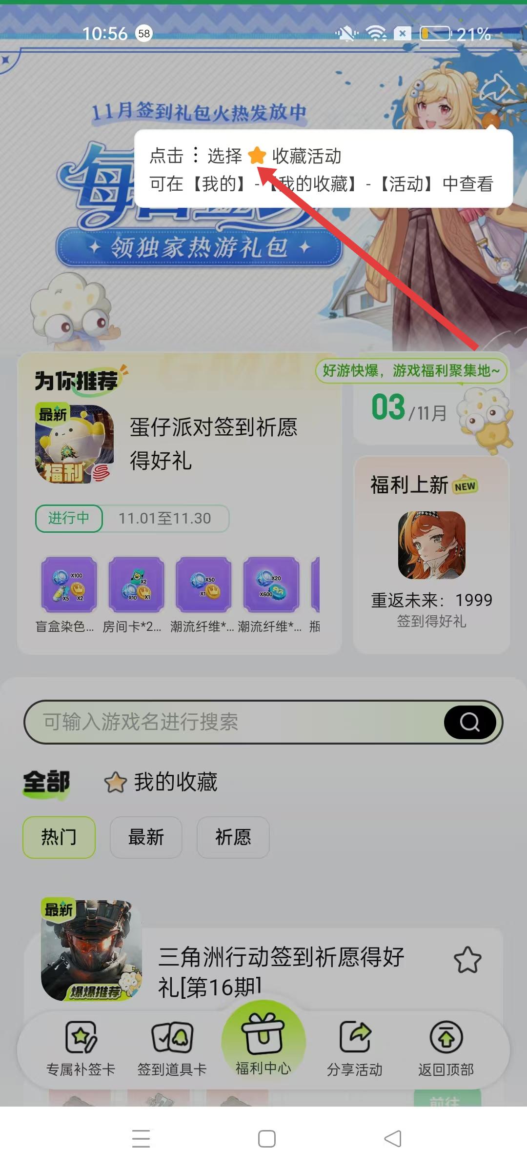 3、福利頁面可看到收藏活動提示,點擊收藏后可我的收藏中查看,還能瀏覽為你推薦的福利活動,如蛋仔派對簽到祈愿得好禮等。