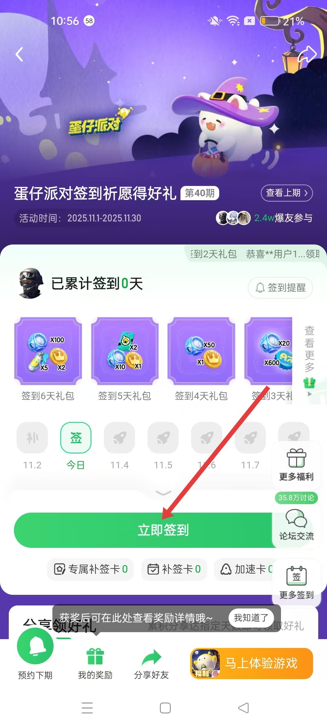4、進入蛋仔派對簽到祈愿得好禮活動頁面,可看到活動時間和簽到獎勵,點擊立即簽到,累計簽到可領取盲盒染色劑、房間卡等獎勵。