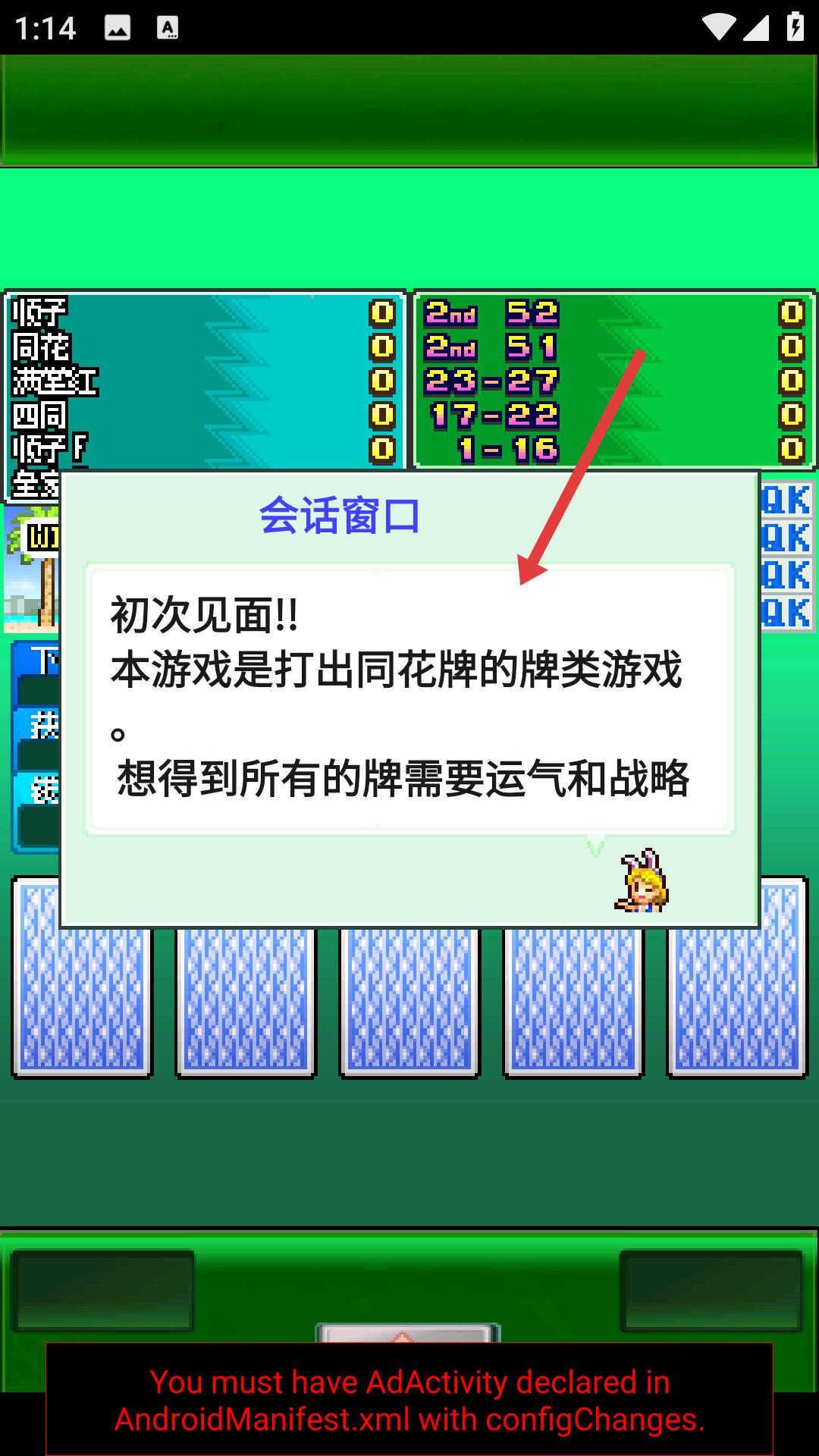 2、進入游戲后,會有會話窗口提示,本游戲是打出同花牌的牌類游戲,要收集所有牌,需結合運氣與戰略。