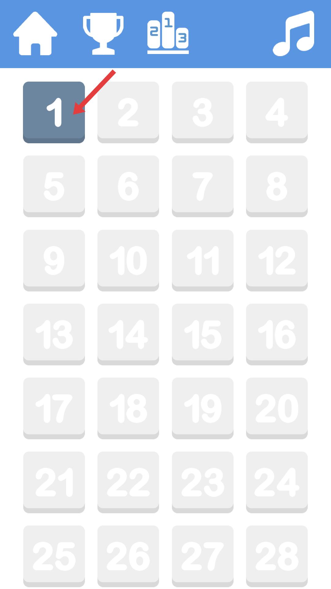 2、關卡選擇界面,有多個帶數字的方塊,點擊標有1的方塊,進入第一關,開始游戲挑戰。
