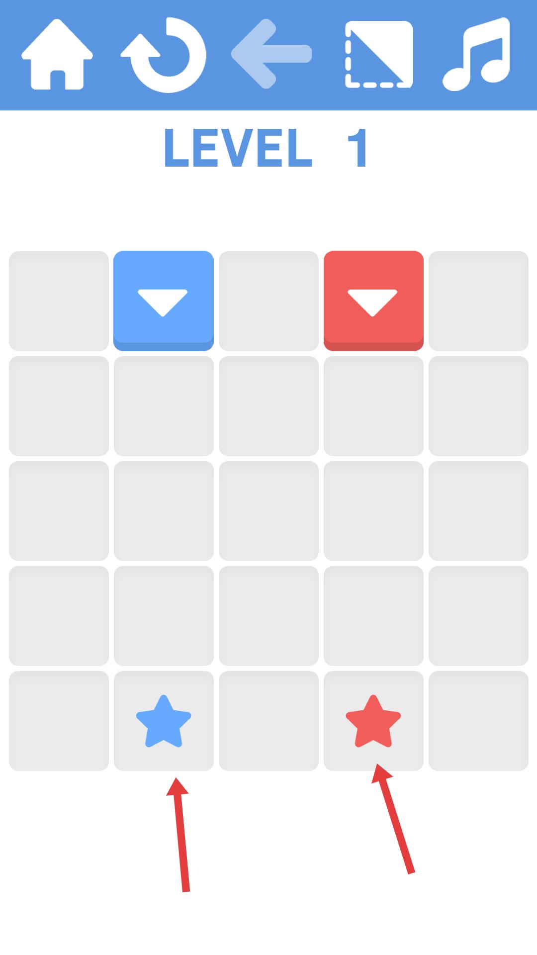 3、第一關界面,有藍色和紅色方塊,下方對應藍色和紅色星星,要推動方塊,使藍色方塊到藍色星星處,紅色方塊到紅色星星處。