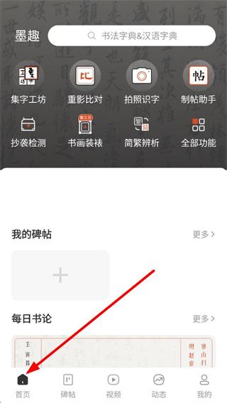 1、進入墨趣首頁,可使用集字工坊、重影比對、拍照識字等功能,還能查看我的碑帖和每日書論,開啟書法學習與交流之旅。