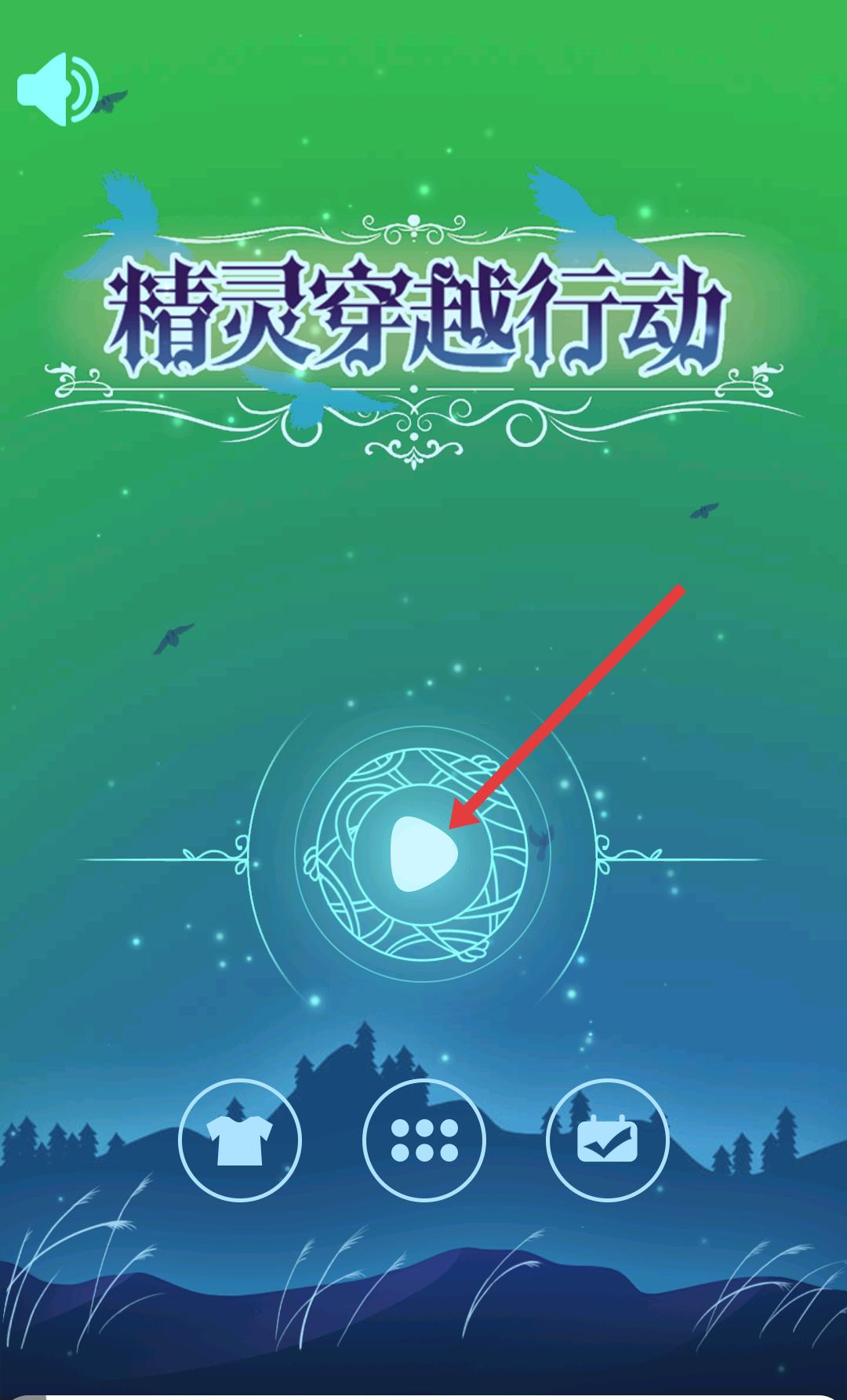 1、游戲初始界面顯示精靈穿越行動,點擊中間的播放按鈕,進入游戲,開啟精靈穿越的冒險之旅,開始挑戰關卡。
