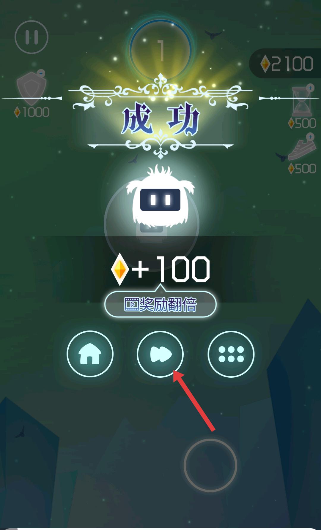4、關卡成功通過后,界面顯示成功,并獲得100鉆石獎勵,點擊中間的箭頭按鈕,可繼續挑戰下一個關卡,獲取更多獎勵。