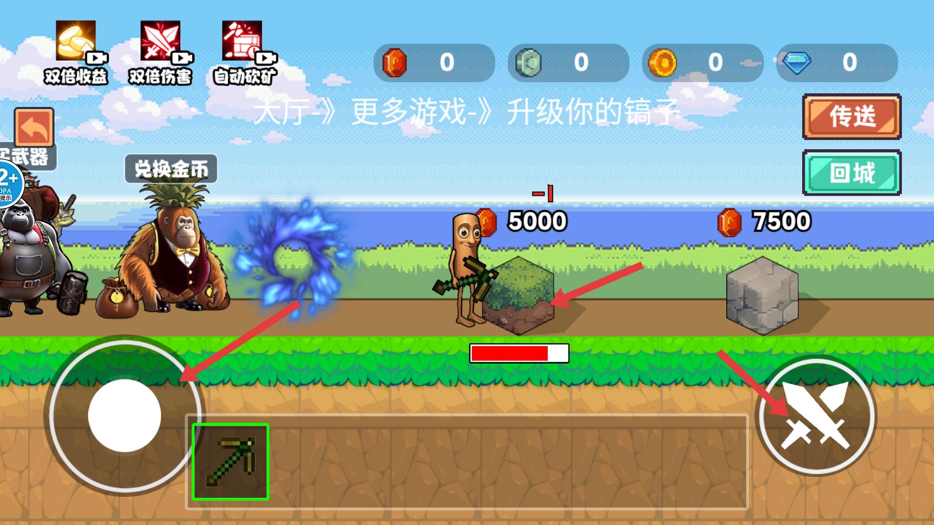 3、便捷操作系統:左側虛擬搖桿控制礦工移動,右側按鈕實現連續敲擊。長按激活蓄力重擊,三指滑動快速切換工具欄,操作邏輯符合觸屏特性。