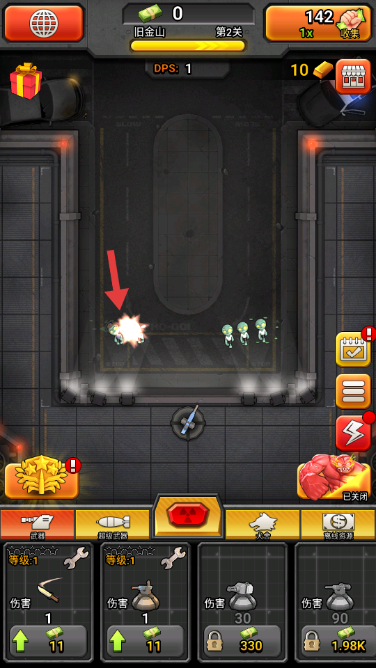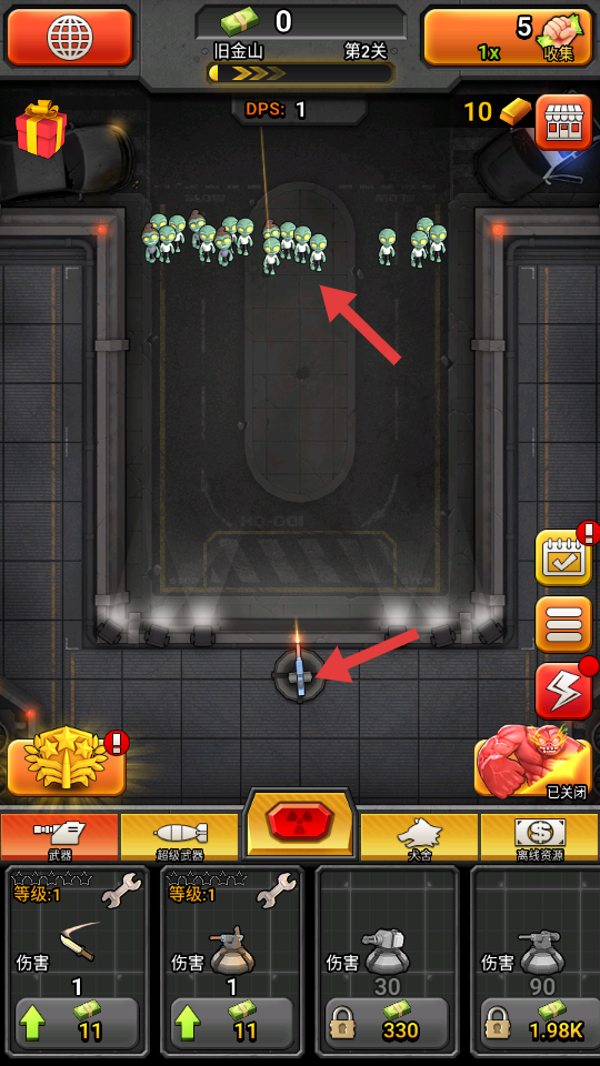 1、面對來襲的僵尸,玩家可以使用武器瞄準,利用基礎武器持續自動攻擊,積攢消滅僵尸獲得的資源,為后續強化做準備。