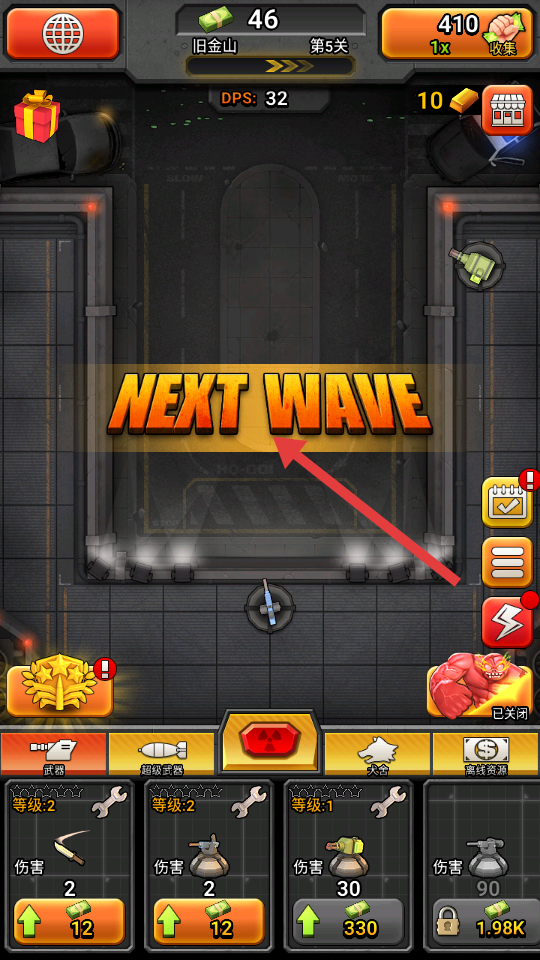4、成功抵御一波僵尸后,會出現NEXT WAVE提示,此時可利用間隙升級已有武器或準備新武器,迎接下一波僵尸挑戰。