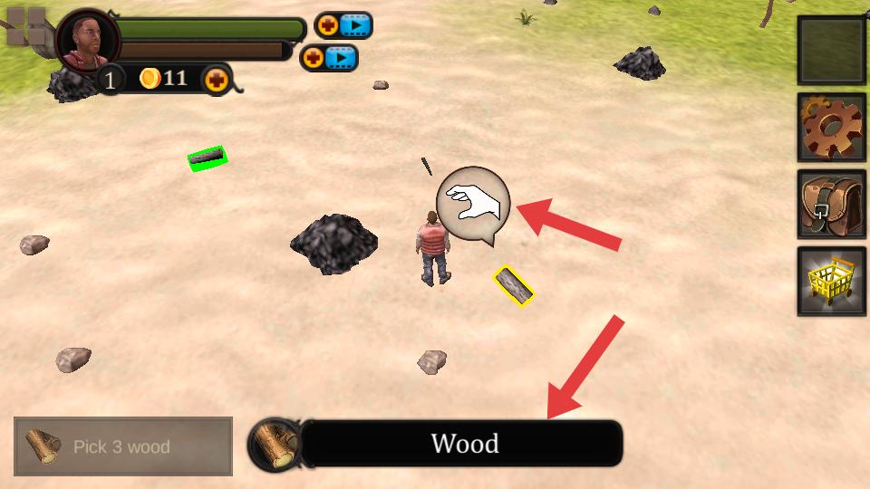 2、在島嶼場景,靠近木材等資源,出現手型圖標時點擊,收集Wood等生存物資。