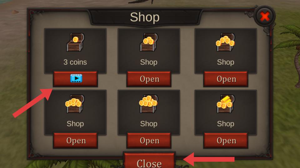 3、進入商店界面,按需點擊寶箱對應按鈕,獲取金幣,操作完點擊Close返回游戲。