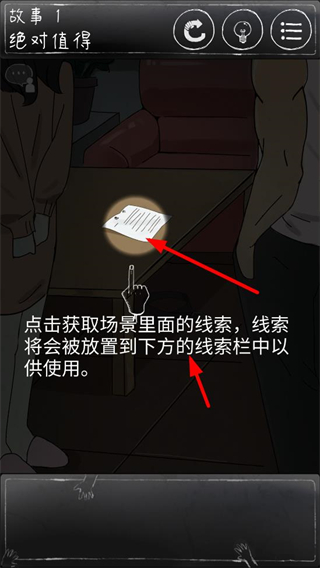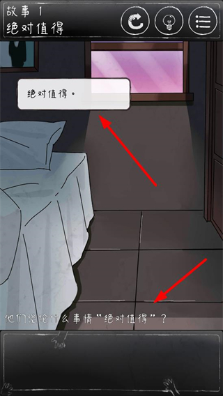 1、進入故事1絕對值得,查看界面里的對話絕對值得,思考他們談論的事情,開啟解謎推理。