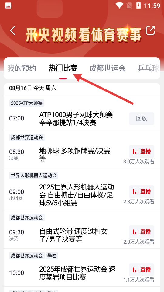 1、央視頻熱門比賽界面,聚焦體育賽事,當天有ATP男子網球大師賽等,成都世運會多項目同步直播可看回放。