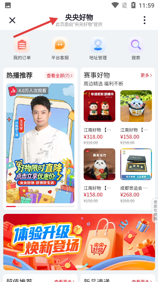 2、央央好物平臺熱播推薦醒目,賽事周邊等商品豐富,涵蓋擺件等,設訂單客服等功能,購物體驗便捷。