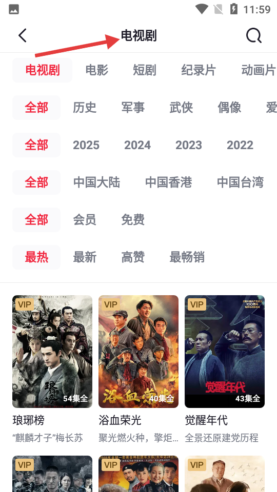 3、央視頻電視劇頻道,分類細致,可按題材、年份、地區篩選,展示瑯琊榜等劇,依熱度等排序方便找劇。