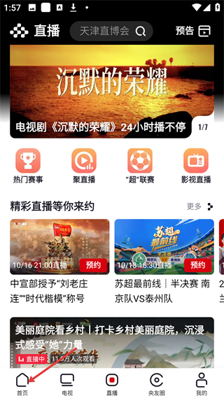1、直播頁面有沉默的榮耀24小時直播,設熱門賽事、聚直播等功能,還有中宣部授劉老莊連稱號、蘇超半決賽等直播可預約。