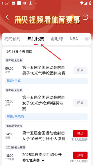 2、體育賽事熱門比賽頁面,10月16日有全運會射擊多項決賽,還有2025丹麥羽毛球公開賽1、8決賽可預約觀看。