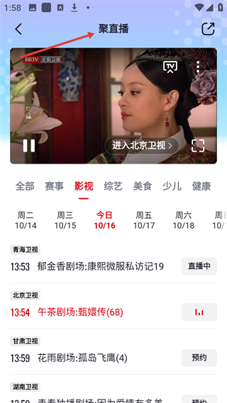 4、聚直播頁面有北京衛視甄嬛傳等影視直播,分賽事、綜藝等類別,還有青海衛視康熙微服私訪記等直播可按需觀看。
