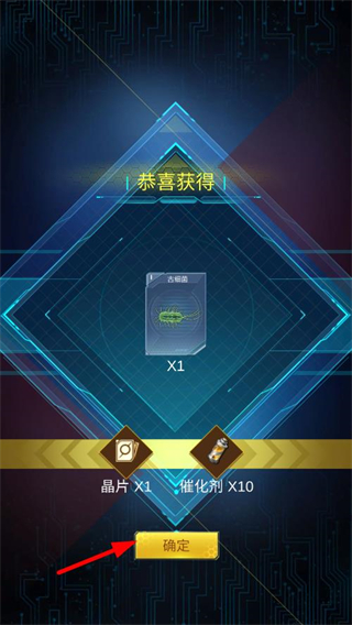 4、打開寶箱后會顯示獲得古細菌卡片及晶片催化劑等道具,點擊確定按鈕確認獎勵,繼續游戲的進化流程。