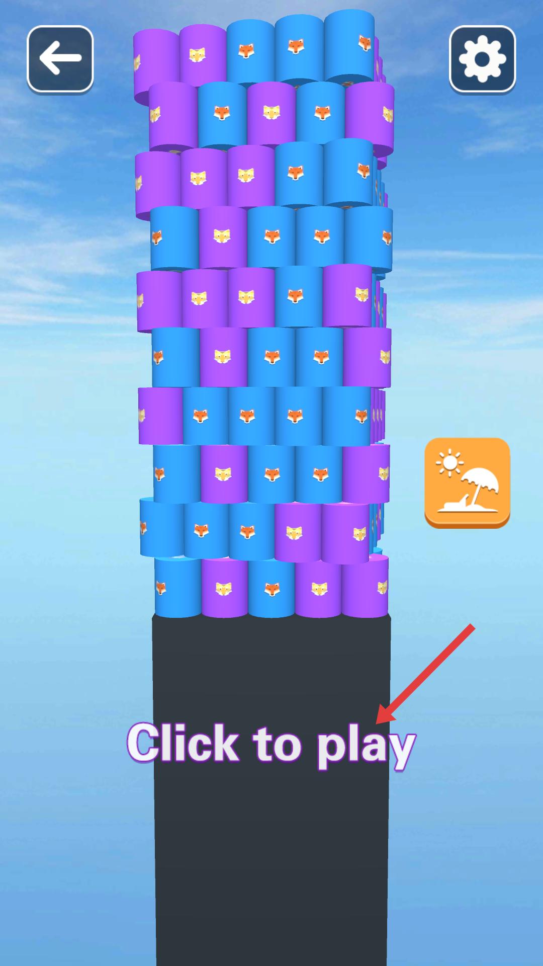 1、游戲初始界面有彩色圓柱塔,下方顯示點擊開始,進入關卡,開啟消除圓柱的挑戰,熟悉游戲啟動方式。