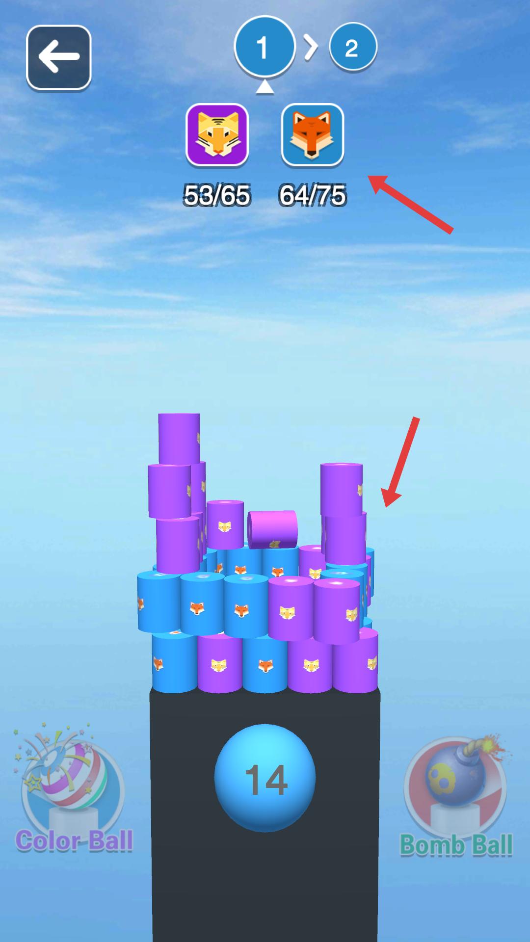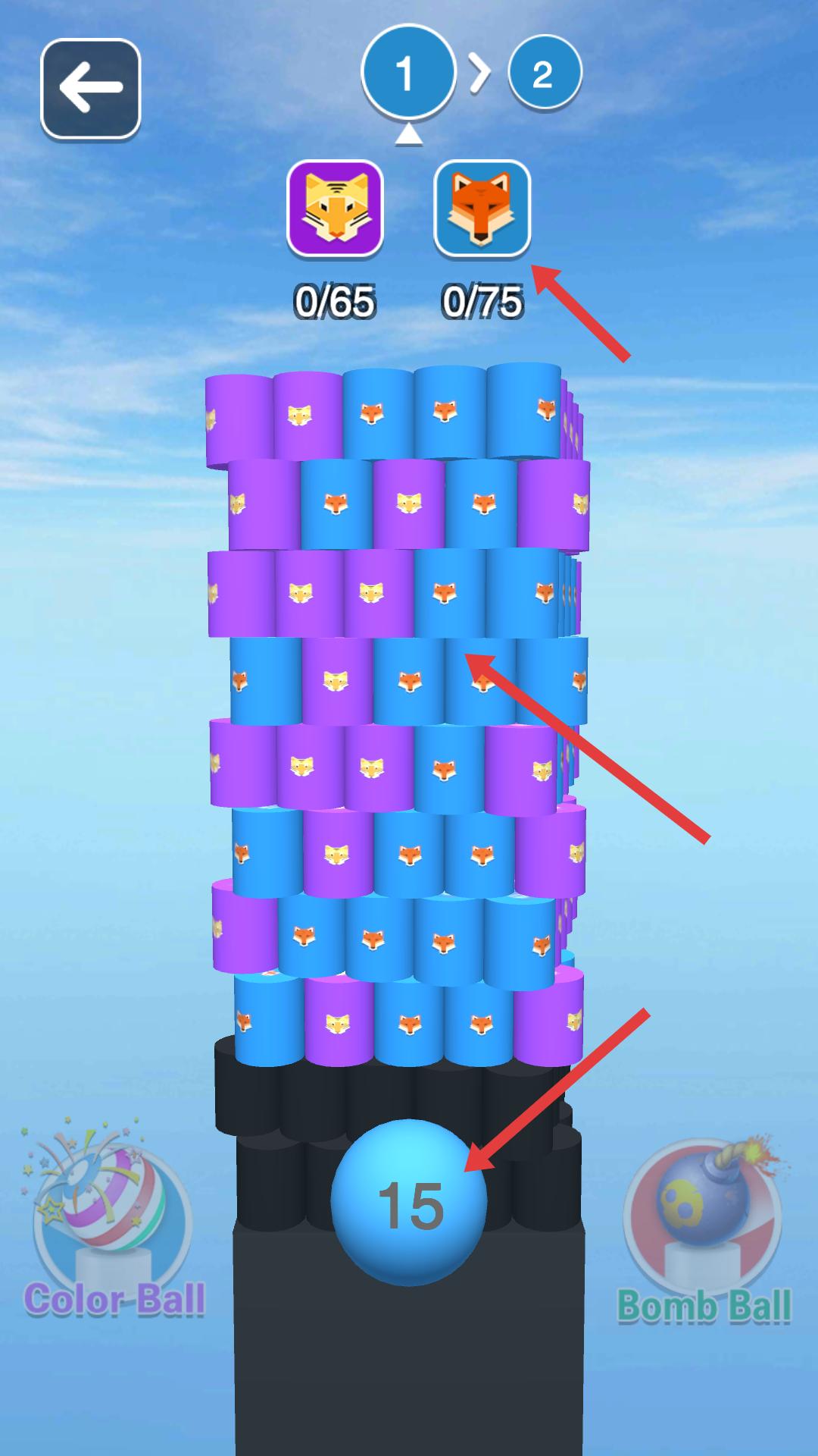 2、進入關卡后,上方顯示需收集的老虎和狐貍圖標數量,下方有帶數字的藍色球,開始收集目標圖標。
