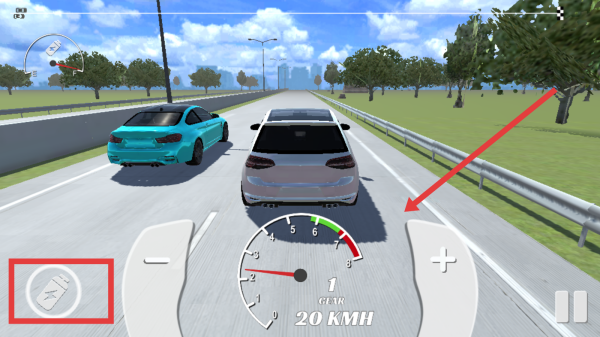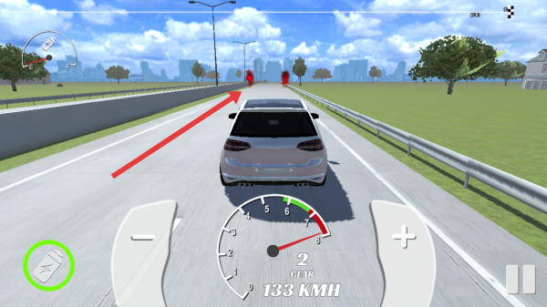 2、進入賽道后通過屏幕左下角的剎車按鈕控制賽車減速,利用屏幕右下角的換擋按鈕以及油門按鈕來控制賽車的速度和行駛狀態。