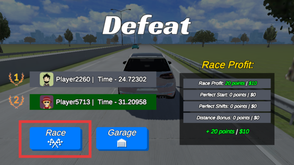 4、如果比賽結束后成績不理想,顯示Defeat界面,玩家可點擊下方的Race按鈕,即可重新進入比賽。