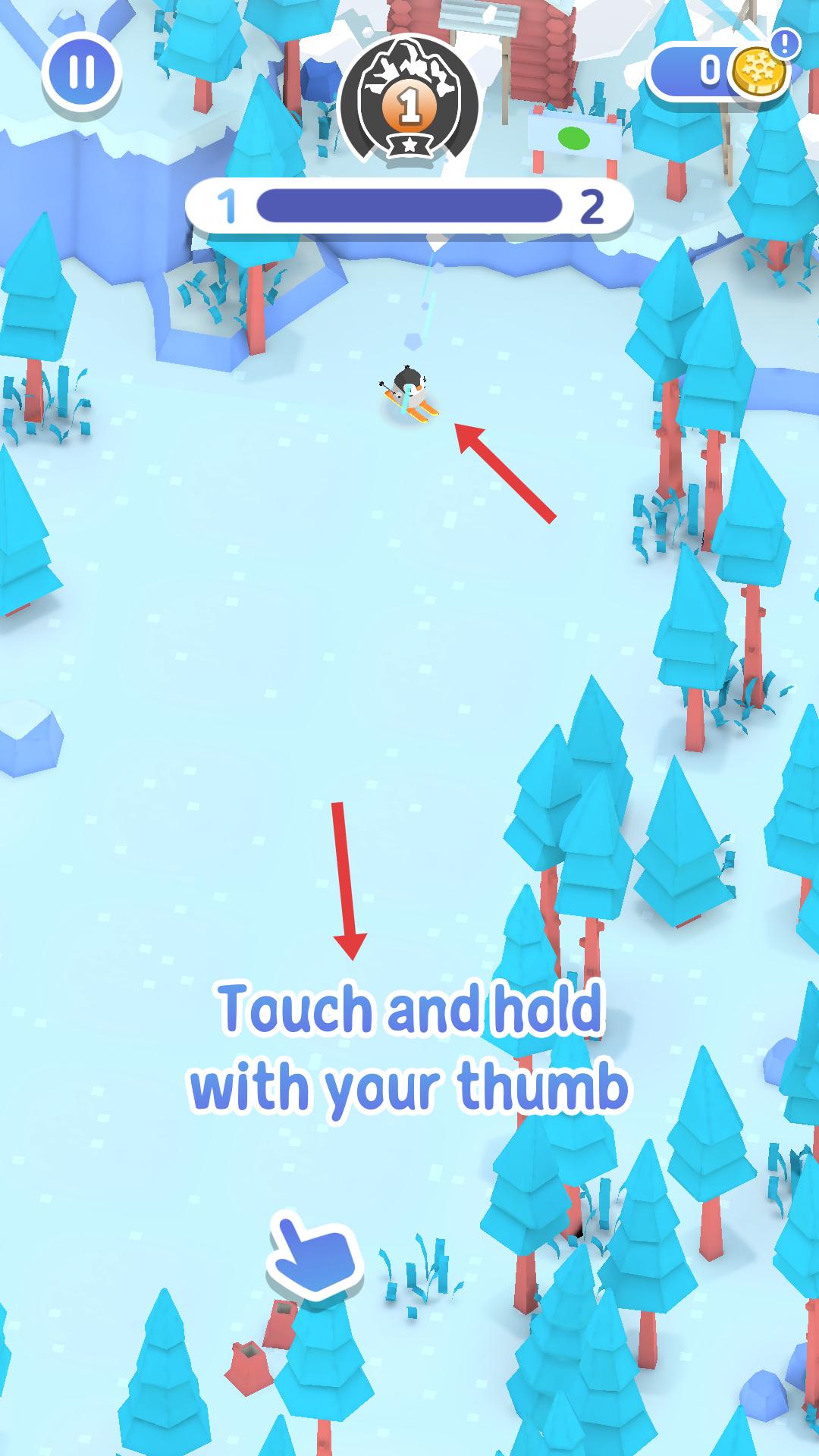 2、進入滑雪場景后,界面提示用拇指觸摸并按住屏幕,操控滑雪的小動物移動,按照提示操作,熟悉滑雪的基本控制方式。