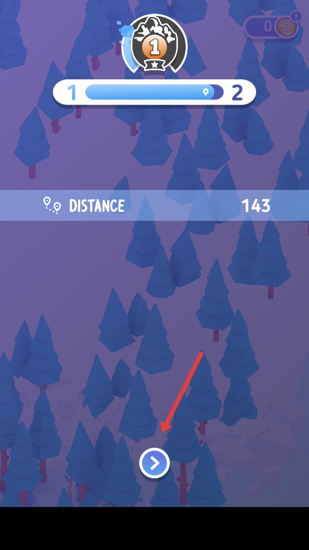 3、滑雪一段距離后,界面顯示已滑行的距離等信息,此時點擊下方箭頭按鈕,可進入下一個界面,繼續推進游戲流程。