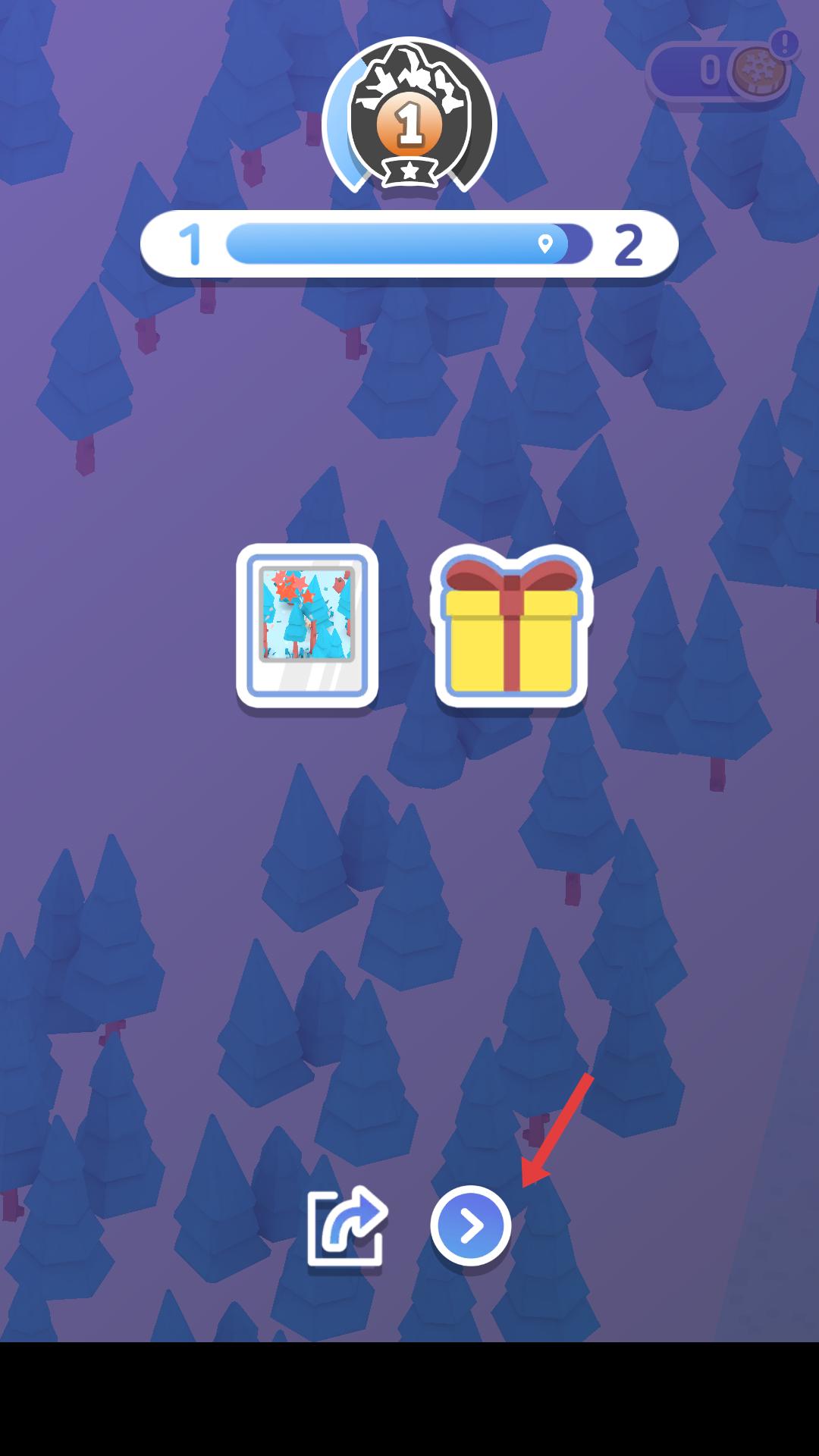 1、游戲初始界面有座小木屋,界面上方顯示進度從1到2,根據指引點擊木屋,開啟游戲,進入滑雪場景,開始探索游戲內容。