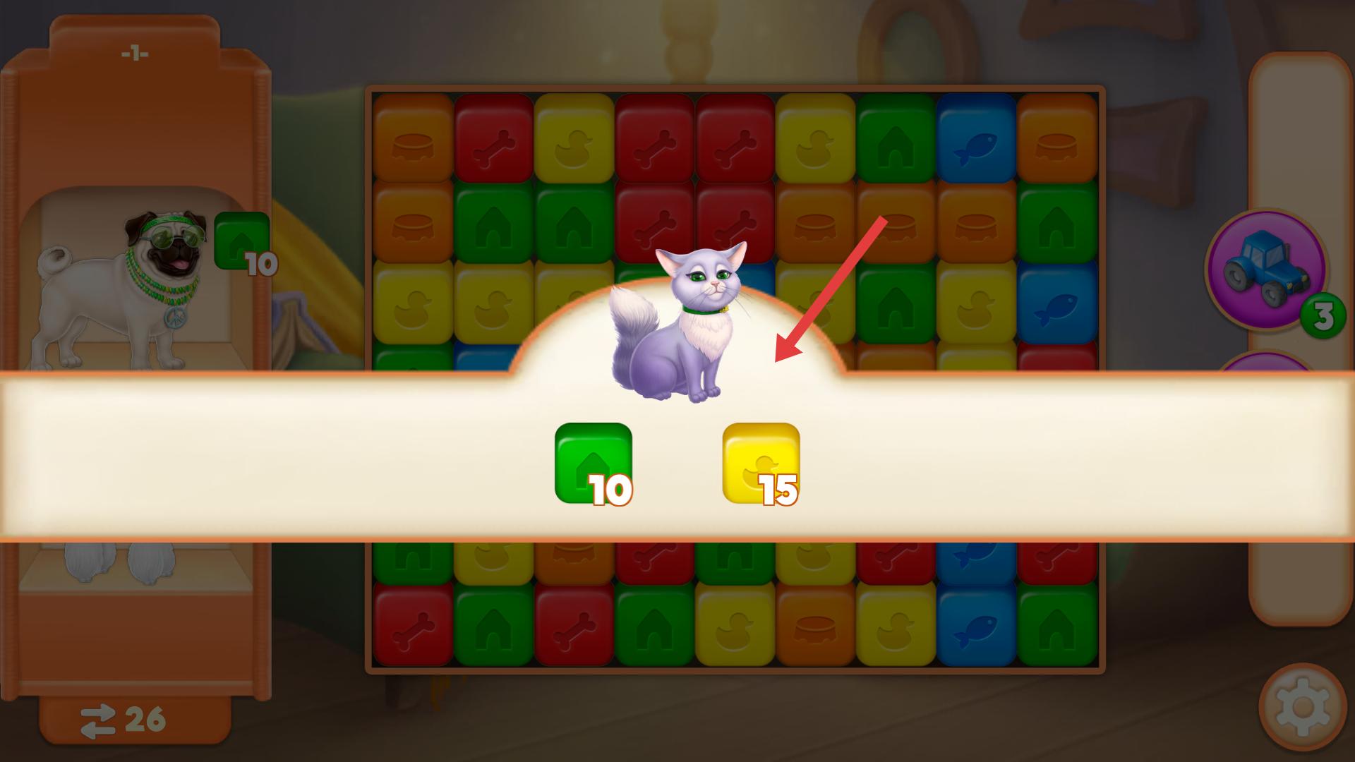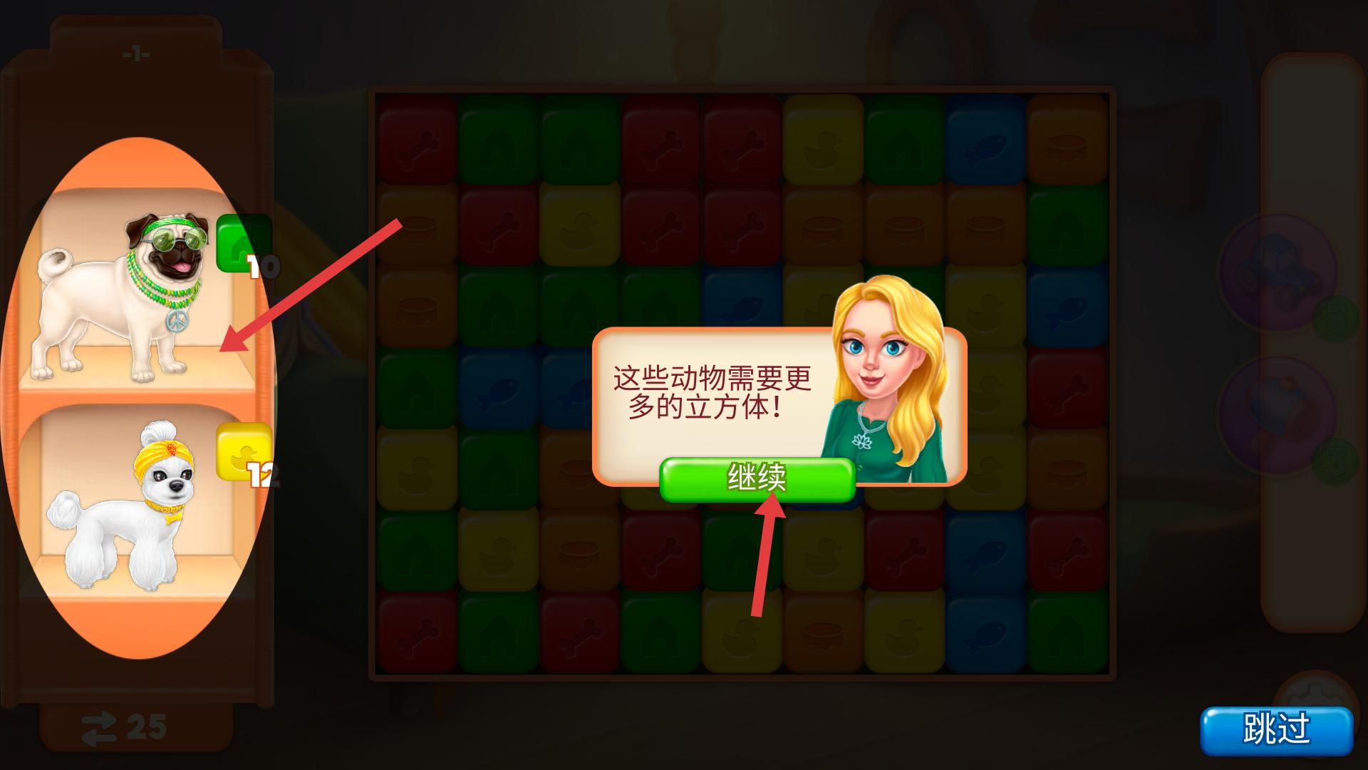 4、收集一定立方體后,界面提示動物需要更多立方體,點擊繼續按鈕,繼續進行消除,為動物收集足夠的立方體,推進游戲。