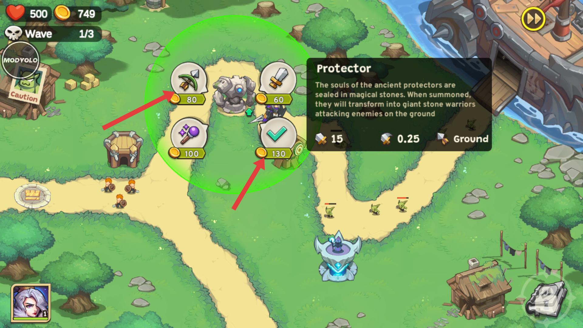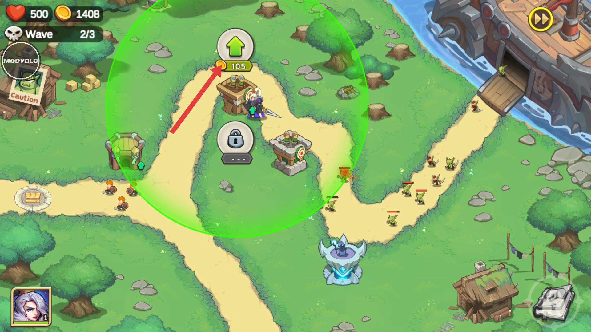 5、當積累足夠金幣,看到防御單位上有升級箭頭時,點擊箭頭消耗金幣升級單位,提升其戰斗力,更好應對敵人。