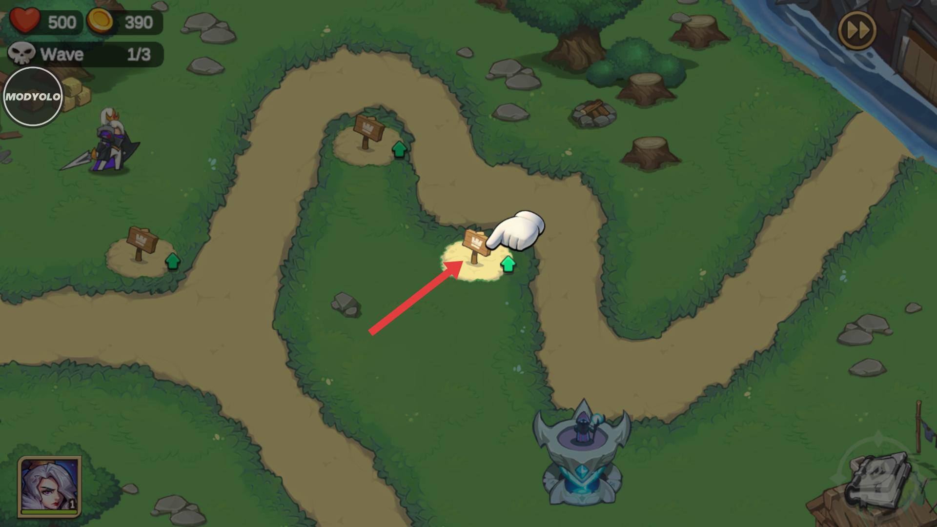 2、游戲開始后,會有手指指引點擊位置,按照指引操作,可在該位置布置防御設施,為后續抵御敵人做準備。
