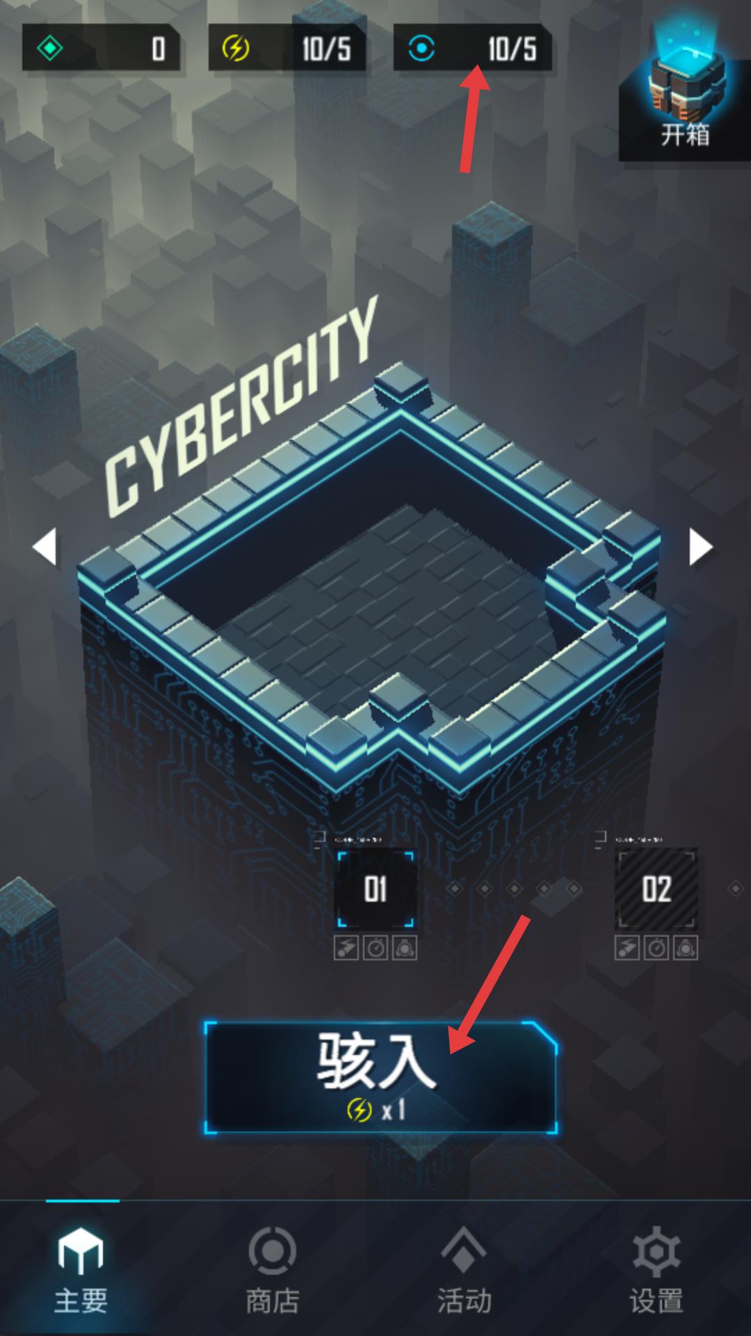 2、進入賽博城市界面,上方顯示資源數量,下方有駭入按鈕,點擊該按鈕,消耗對應資源,進入駭入關卡,開始挑戰。